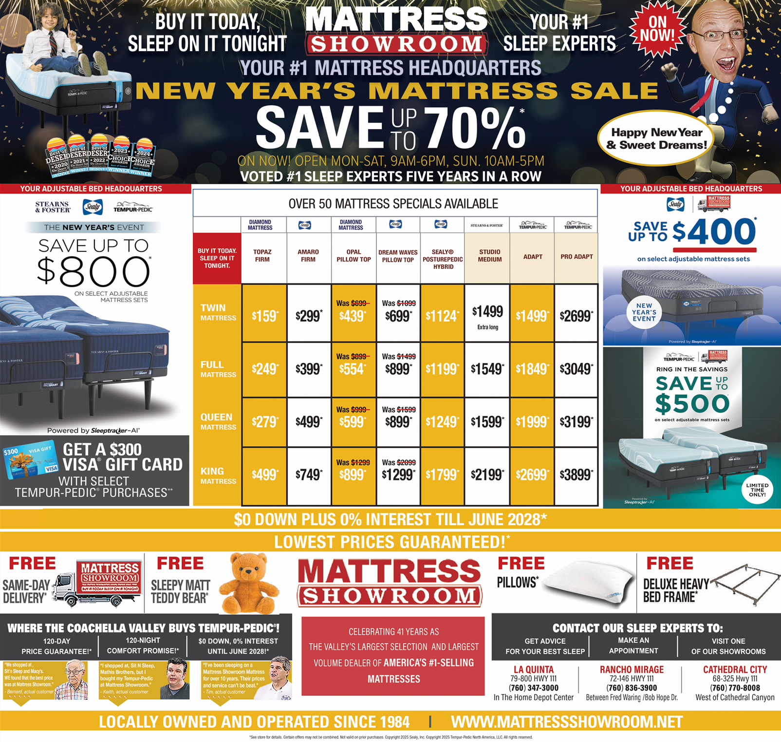 Don’t miss out on your chance to save hundredsโand in some cases, thousandsโon your next mattress purchase. Our commitment is to provide the best value and service in Palm Springs, Cathedral City, Rancho Mirage, Palm Desert, and La Quinta. Explore our current flyers today and visit the Mattress Showroom nearest you to experience these amazing deals in person and let our sleep experts help you find the perfect bed.