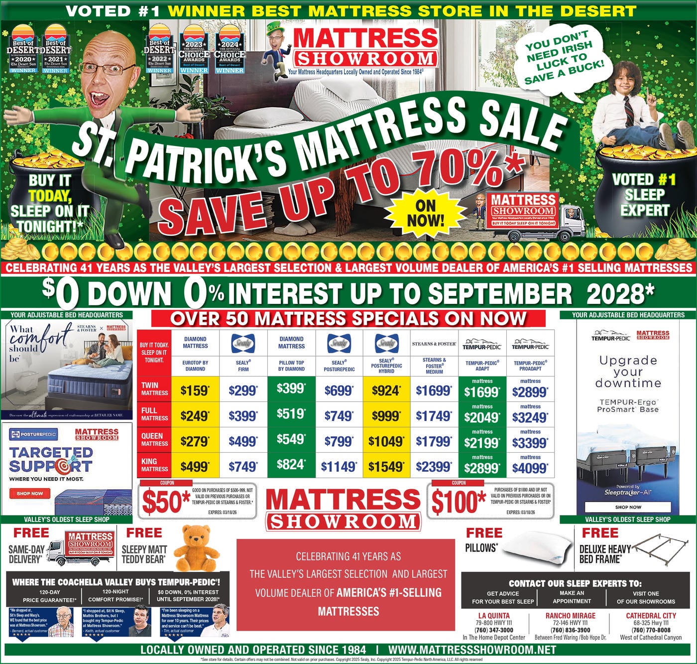 Are you looking to buy a mattress without breaking the bank? You’ve come to the right place! At Mattress Showroom, we believe everyone deserves a great night’s sleep at a price they can afford. Our flyers page is your go-to destination for the latest promotions and mattress specials happening now at our Coachella Valley locations. We regularly update this page with exclusive offers on top brands like Sealy, Tempur-Pedic, and Stearns & Foster, ensuring you get the 5-star quality you deserve for less.