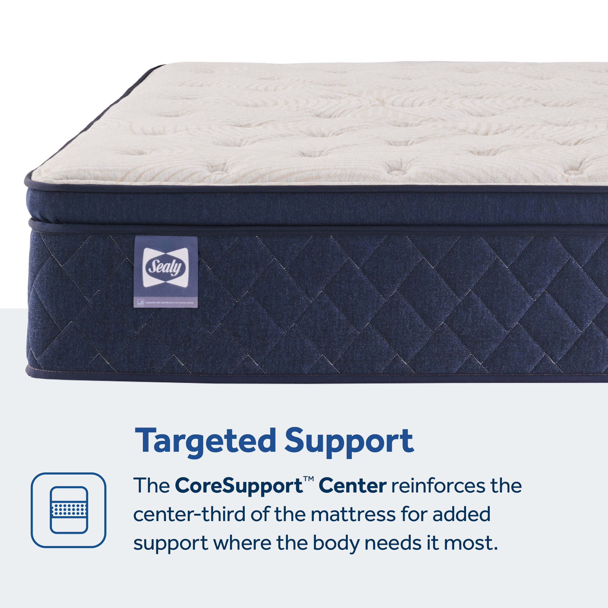 This Euro Pillow Top innerspring mattress provides even more edge-to-edge support through the combination of our SealyStability™ encased coils and the StableEdge™ Pro system. The addition of the CoreSupport™ center provides extra support for the heaviest part of the body with an additional layer of high-quality memory foam.