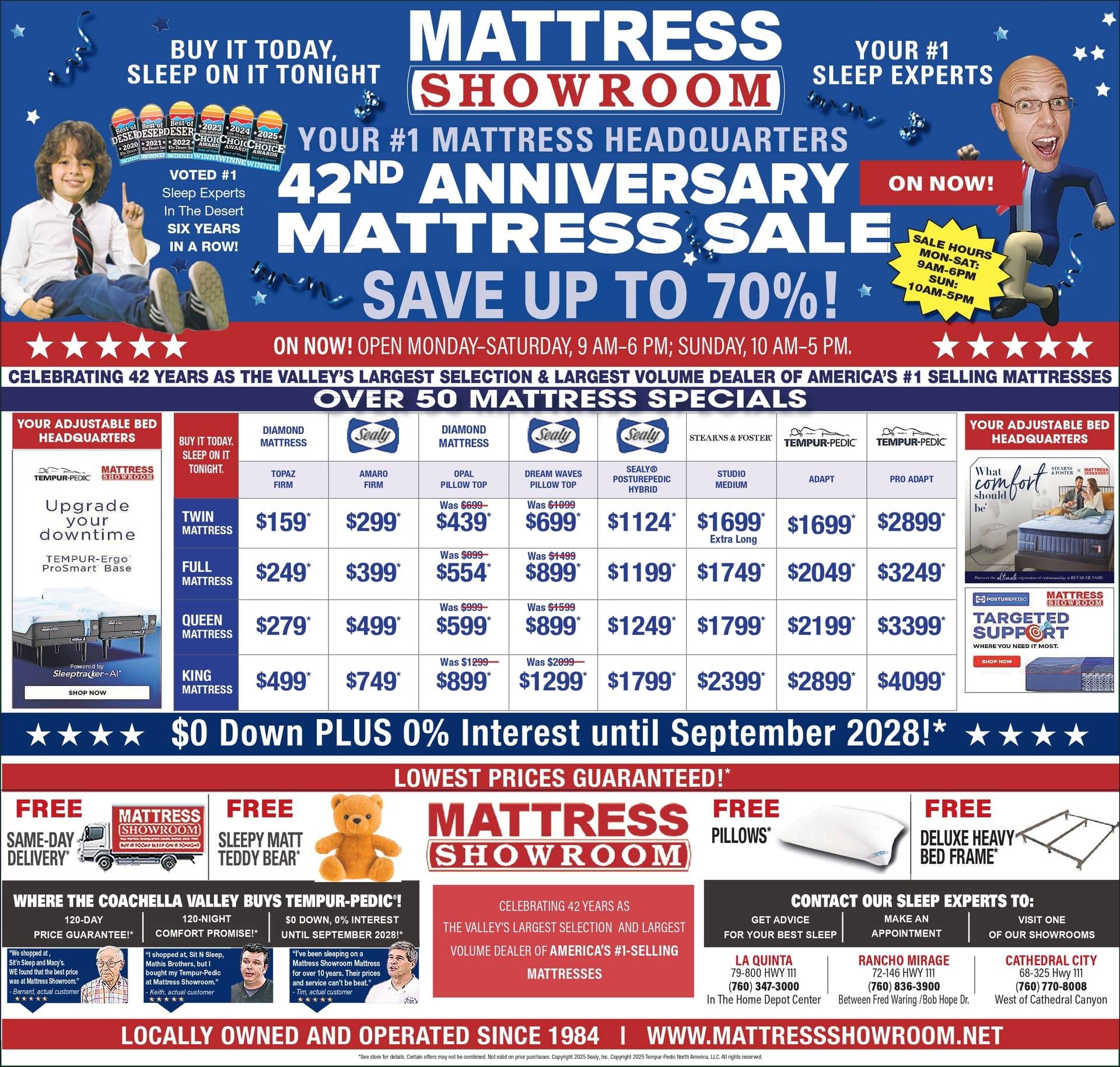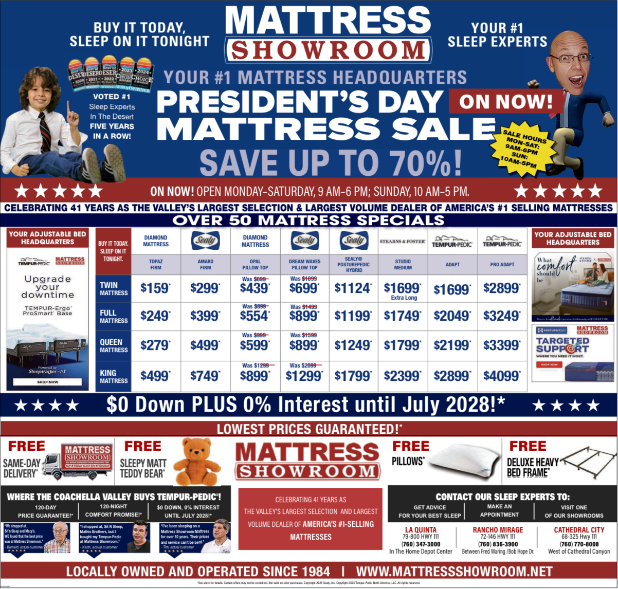 At Mattress Showroom, we’re honored to be your trusted local sleep experts, Voted Best of Desert Community Choice Awards 5 years in a row! We understand that a good night’s sleep is essential to your well-being, and our mission is to provide the very best mattresses in Palm Springs, Cathedral City, Rancho Mirage, Palm Desert, Indian Wells, La Quinta and Indio.